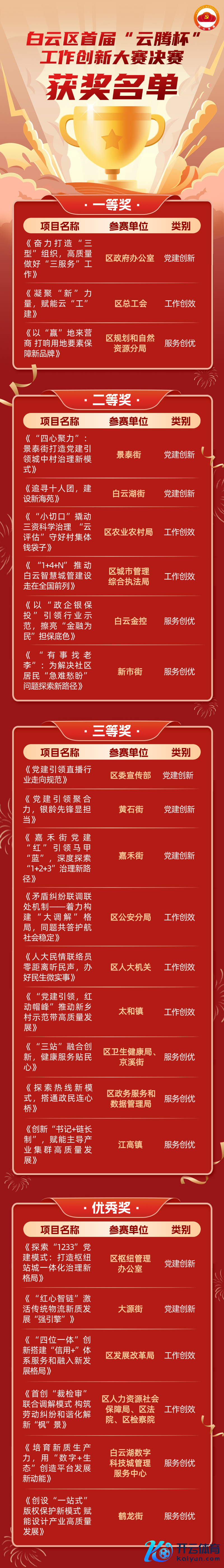 11月12日,白云区首届“云腾杯”职责更始大赛在广州遐想之齐遐想殿堂举行,共有24个参赛名堂晋级决赛,白云区政府办公室《奋发打造“三型”组织,高质地作念好“三服务”职责》、白云区总工会《凝合“新”力量,赋能云“工”建》、市绸缪和当然资源局白云差异局《以“赢”地来营商 打响用地身分保险新品牌》分别取得大赛党建更始类、职责创效类、服务创优类的一等奖。