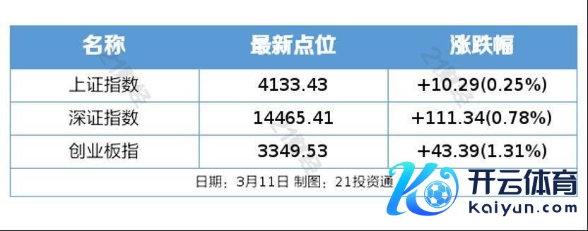 昨日A股3月11日,三大指数集体收涨云开体育,创业板指冲高回落,此前一度涨超2%,黄白线显著分化。法律讲明收盘,沪指涨0.25%,深成指涨0.78%,创业板指涨1.31%。沪深两市成交额2.51万亿,较上一个交过去放量1105亿。