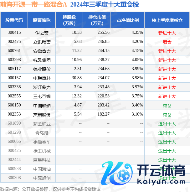 前海开源一带一起夹杂A为夹杂型-纯真基金,把柄最新一期基金季报披露,该基金金钱建树:股票占净值比92.36%,无债券类金钱,现款占净值比7.75%。基金十大重仓股如下: