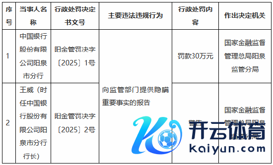 1月24日金融一线音书,国度金融监督措置总局阳泉监管分局行政处罚信息公开表泄漏,中国银行股份有限公司阳泉市分行因向监管部门提供守隐秘害事实的申诉被罚金30万元。王威(时任中国银行股份有限公司阳泉市分行行长)对上述违法违游记径负有株连,受到告诫。